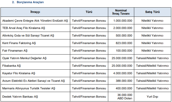 SPK’nın borçlanma aracı ihracını onayladığı şirketler: