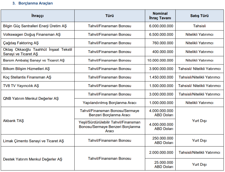 SPK’nın borçlanma aracı ihracını onayladığı şirketler: