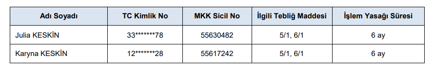 2 kişiye borsalarda 6 ay işlem yasağı kararı