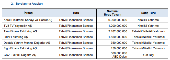 SPK’nın borçlanma aracı ihracını onayladığı şirketler: