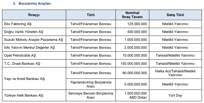 SPK’nın borçlanma aracı ihracını onayladığı şirketler: