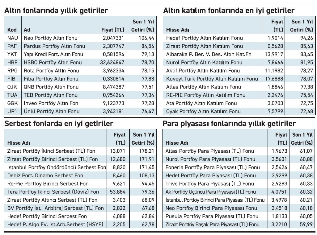 Ekonomim yazarı Zeynep Aktaş’ın kaleme aldığı yazıya göre, altın ve altın katılım fonları son bir yılda yüzde 100’ü aşan getirilerle yatırımcısına hem güvenli liman hem de yüksek kazanç sundu; fiziki altın yerine fonlara yönelim ise artarak devam ediyor.