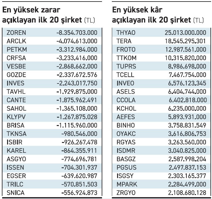 Açıklanan sonuçlara göre en yüksek zararı 8 milyar 354 milyon TL ile Zorlu Enerji açıkladı. Onu 4 milyar TL’nin üzerinde zararla Arçelik ve 3,3 milyar TL ile Petkim takip etti. Diğer yandan kâr tarafında öne çıkan şirket 25 milyar TL’nin üzerinde net kâr açıklayan Türk Hava Yolları (THYAO) oldu. İlk çeyrekte de dikkat çeken Tera Yatırım Menkul Değerler (TERA) ise 18,5 milyar TL kârla ikinci sıraya yerleşti.