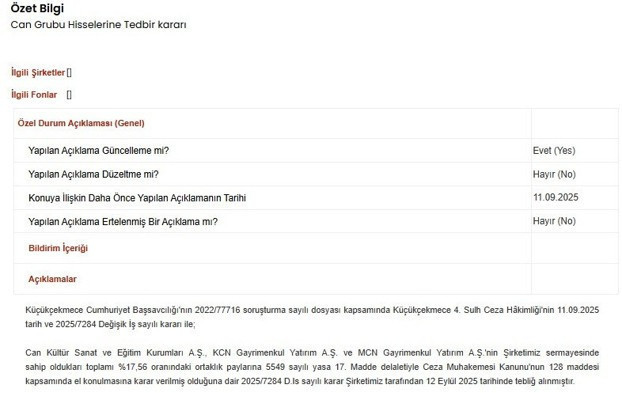 Şirketin Kamuyu Aydınlatma Platformu’na (KAP) yaptığı duyuruda, Can Grubu’na ait hisselerin yargı kararıyla dondurulduğu belirtildi.