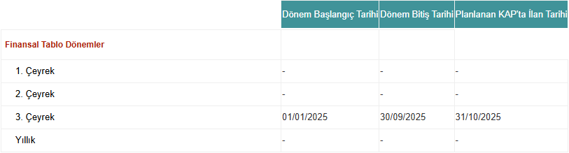 Şirketimizin 01.01.2025 – 30.09.2025 hesap dönemine ilişkin finansal raporlarının 31 Ekim 2025 tarihinde kamuya açıklanması planlanmaktadır.