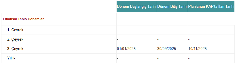 Şirketimizin 01.01.2025 - 30.09.2025 ara hesap dönemine ilişkin finansal raporlarının 10 Kasım 2025 tarihinde kamuya açıklanması planlanmaktadır.