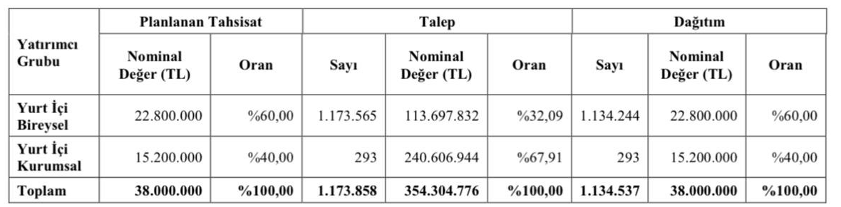 Toplamda 1 milyon 173 bin 858 yatırımcıdan 354 milyon 304 bin 776 TL nominal değerli talep toplanırken, dağıtım sonucunda 1 milyon 134 bin 537 yatırımcıya 38 milyon TL nominal değerli pay tahsis edildi.
