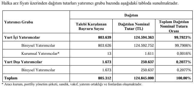 Dağıtım sonucunda ise 805.312 yatırımcıya toplam 124.845.000 TL nominal değerli pay dağıtıldı.