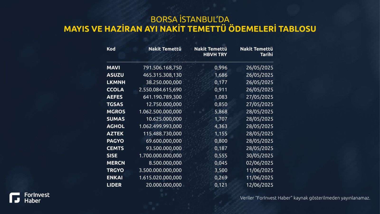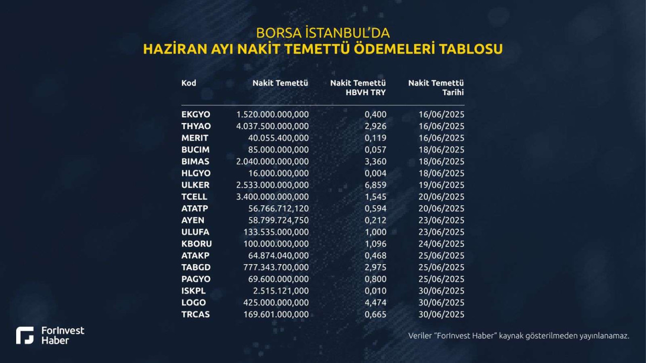 ForInvest Haber’in derlediği verilere göre, 26 Mayıs ile 30 Haziran 2025 tarihleri arasında onlarca şirket, toplamda milyarlarca liralık temettü ödemesi gerçekleştirecek.