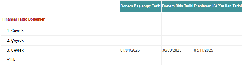 Şirketimizin 01.01.2025 – 30.09.2025 hesap dönemine ilişkin finansal raporlarının 3 Kasım 2025 tarihinde kamuya açıklanması planlanmaktadır.