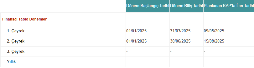 Şirketimiz 2025 yılı 2. çeyrek finansal sonuçlarının TMS 34 Ara dönem finansal raporlama standardı ile uyumlu olarak 15 Ağustos 2025 tarihinde Kamuyu Aydınlatma Platformu'nda yayınlanması planlanmaktadır.