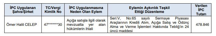 Abone olSPK haftalık bülteninde yer alan kararda, yapılan inceleme sonucunda açığa satışla ilgili olarak mevzuatta yer alan hükümlerin ihlali gerekçesiyle bir kişi hakkında idari para cezası verildi.