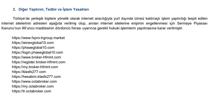 Abone olSermaye Piyasası Kurulu’nun (SPK) bu akşam yayımladığı bültende, internet aracılığı ile yurt dışında kaldıraçlı işlem yaptırıldığı belirlenen 12 siteye erişim engeli getirilmesi için hukuki işlemlerin yapılmasına karar verdi.