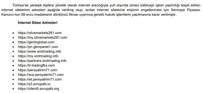 Abone olSermaye Piyasası Kurulu’nun (SPK) bu akşam yayımladığı bültende, internet aracılığı ile yurt dışında kaldıraçlı işlem yaptırıldığı belirlenen 13 siteye erişim engeli getirilmesi için hukuki işlemlerin yapılmasına karar verdi.