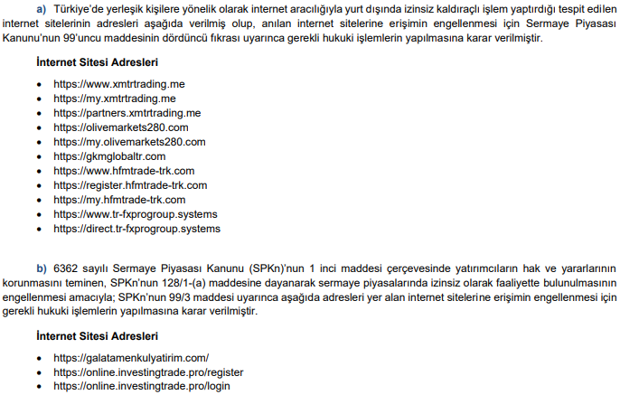 Abone olSermaye Piyasası Kurulu’nun (SPK) bu akşam yayımladığı bültende, internet aracılığı ile yurt dışında kaldıraçlı işlem yaptırıldığı belirlenen 14 siteye erişim engeli getirilmesi için hukuki işlemlerin yapılmasına karar verdi.