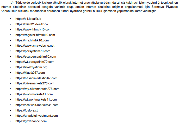 Abone olSermaye Piyasası Kurulu’nun (SPK) bu akşam yayımladığı bültende, internet aracılığı ile yurt dışında kaldıraçlı işlem yaptırıldığı belirlenen 20 siteye erişim engeli getirilmesi için hukuki işlemlerin yapılmasına karar verdi.