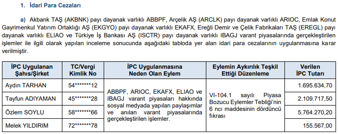 Abone olSermaye Piyasası Kurulu’nun (SPK) bu akşam yayımladığı bültendeki para cezaları;