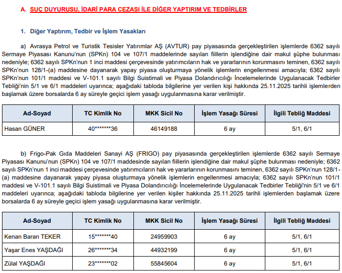 Avrasya Petrol ve Turistik Tesisler Yatırımlar AŞ (AVTUR) pay piyasasında gerçekleştirilen işlemlerde 6362 sayılı Sermaye Piyasası Kanunu’nun (SPKn) 104 ve 107/1 maddelerinde sayılan fiillerin işlendiğine dair makul şüphe bulunması nedeniyle; 6362 sayılı SPKn’nun 1 inci maddesi çerçevesinde yatırımcıların hak ve yararlarının korunmasını teminen, 6362 sayılı SPKn’nun 128/1-(a) maddesine dayanarak yapay piyasa oluşturmaya yönelik işlemlerin engellenmesi amacıyla; 6362 sayılı SPKn’nun 101/1 maddesi ve V-101.1 sayılı Bilgi Suistimali ve Piyasa Dolandırıcılığı İncelemelerinde Uygulanacak Tedbirler Tebliği’nin 5/1 ve 6/1 maddeleri uyarınca; aşağıdaki tabloda bilgilerine yer verilen kişi hakkında 25.11.2025 tarihli işlemlerden başlamak üzere borsalarda 6 ay süreyle geçici işlem yasağı uygulanmasına karar verildi. Frigo-Pak Gıda Maddeleri Sanayi AŞ (FRIGO) pay piyasasında gerçekleştirilen işlemlerde 6362 sayılı Sermaye Piyasası Kanunu’nun (SPKn) 104 ve 107/1 maddesinde sayılan fiillerin işlendiğine dair makul şüphe bulunması nedeniyle; 6362 sayılı SPKn’nun 1 inci maddesi çerçevesinde yatırımcıların hak ve yararlarının korunmasını teminen, 6362 sayılı SPKn’nun 128/1- (a) maddesine dayanarak yapay piyasa oluşturmaya yönelik işlemlerin engellenmesi amacıyla; 6362 sayılı SPKn’nun 101/1 maddesi ve V-101.1 sayılı Bilgi Suistimali ve Piyasa Dolandırıcılığı İncelemelerinde Uygulanacak Tedbirler Tebliği’nin 5/1 ve 6/1 maddeleri uyarınca; aşağıdaki tabloda bilgilerine yer verilen kişiler hakkında 25.11.2025 tarihli işlemlerden başlamak üzere borsalarda 6 ay süreyle geçici işlem yasağı uygulanmasına karar verildi.