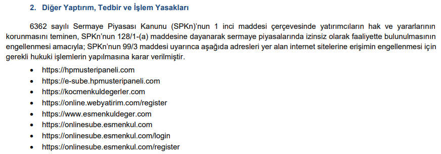 Abone olSermaye Piyasası Kurulu’nun (SPK) bu akşam yayımladığı bültende, internet aracılığı ile yurt dışında kaldıraçlı işlem yaptırıldığı belirlenen 8 siteye erişim engeli getirilmesi için hukuki işlemlerin yapılmasına karar verdi.
