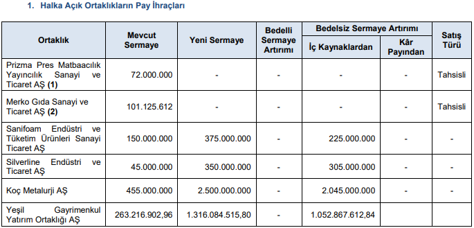 Abone olBu akşam yayımlanan bültende, Prizma Pres Matbaacılık Yayıncılık Sanayi ve Ticaret AŞ (PRZMA) ve Merko Gıda Sanayi ve Ticaret A.Ş (MERKO) için tahsisli, Sanifoam Endüstri ve Tüketim Ürünleri Sanayi ve Ticaret A.Ş. (SANFM), Silverline Endüstri ve Ticaret A.Ş. (SILVR), Koç Metalurji A.Ş. (KOCMT) ve Yeşil Gayrimenkul Yatırım Ortaklığı A.Ş. (YGYO) için bedelsiz sermaye artırımlarına onay verildi.