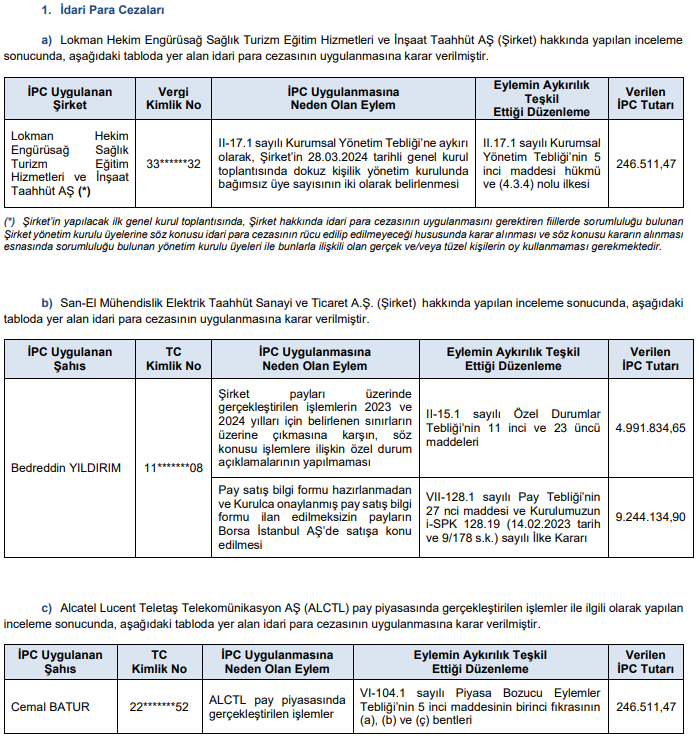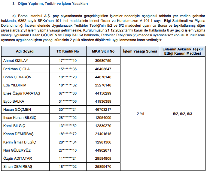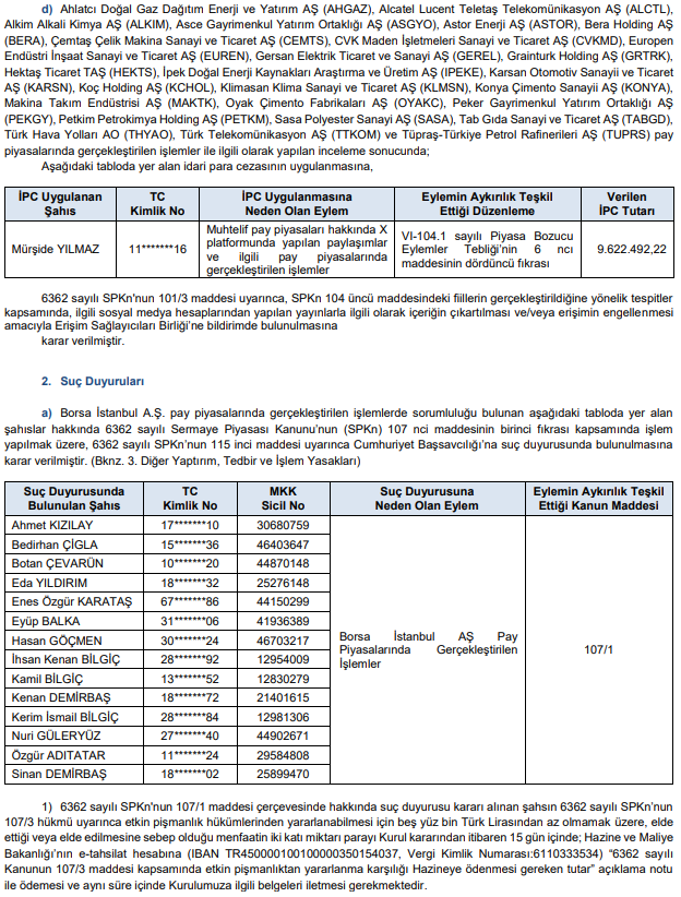 Abone olSermaye Piyasası Kurulu’nun (SPK) bu akşam yayımladığı bültendeki suç duyurusu ve para cezaları;