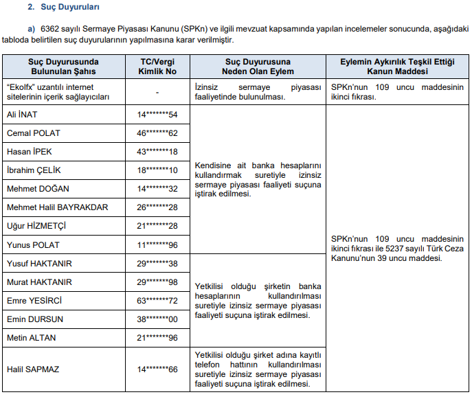 Abone olSermaye Piyasası Kurulu’nun (SPK) bu akşam yayımladığı bültendeki suç duyurusu ve para cezaları;
