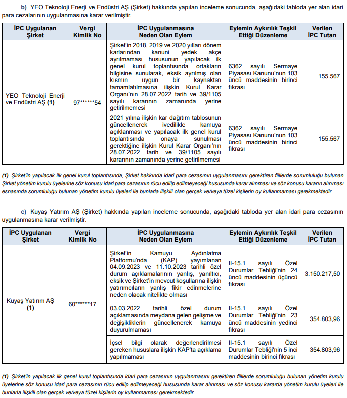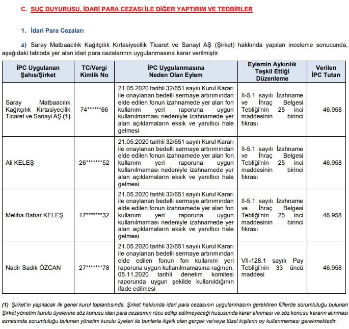 Abone olSermaye Piyasası Kurulu’nun (SPK) bu akşam yayımladığı bültendeki suç duyurusu ve para cezaları;