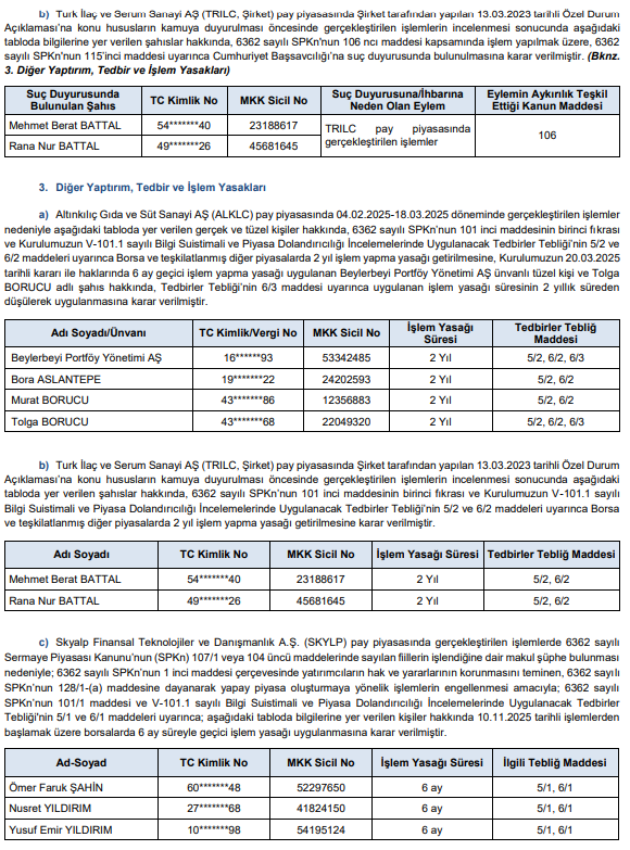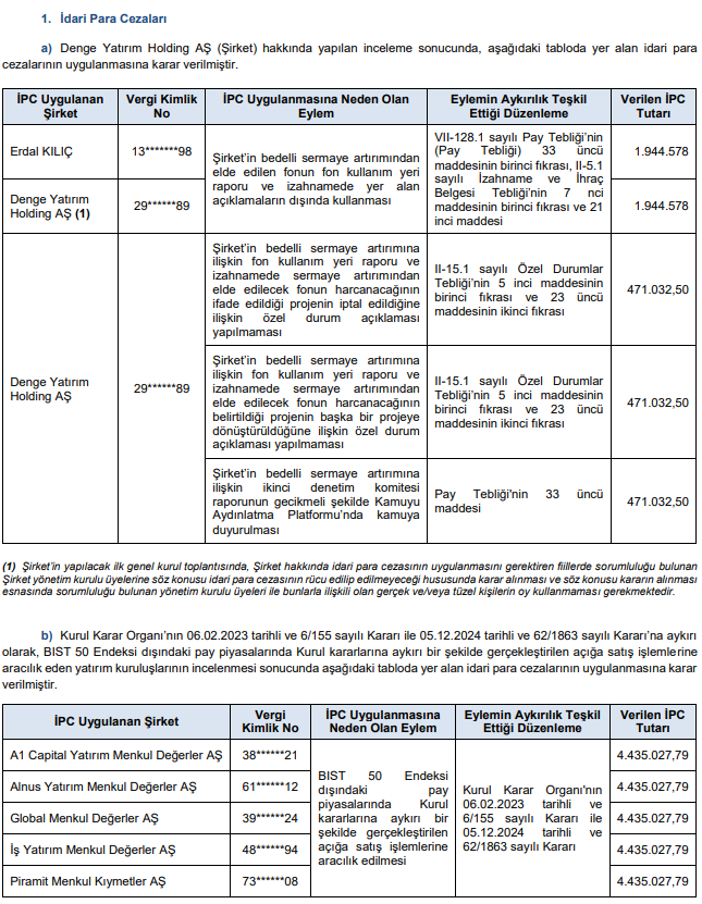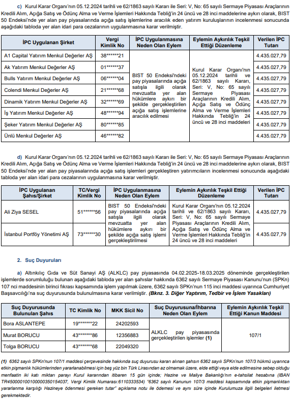 Abone olSermaye Piyasası Kurulu’nun (SPK) bu akşam yayımladığı bültendeki suç duyurusu ve para cezaları;