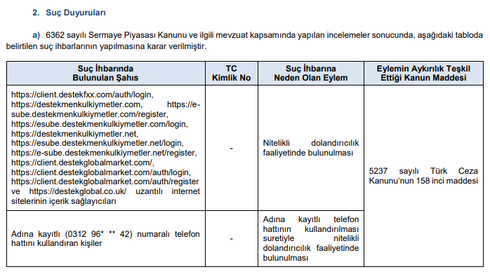 Ayrıca Kurul, yapılan incelemeler sonucunda tespit edilen fiillerle ilgili olarak, yine tabloda belirtilen başlıklar kapsamında suç duyurusunda bulunulmasına karar verdi.