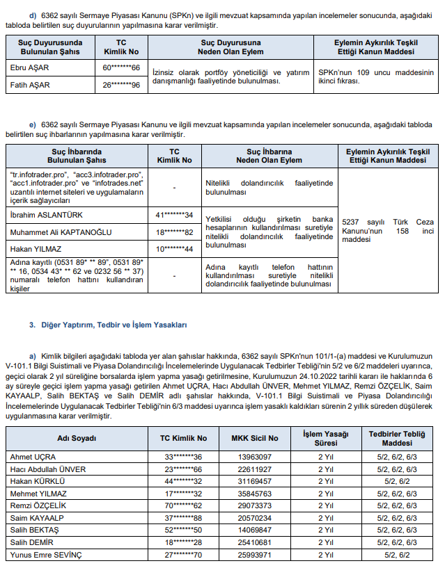 Abone olSermaye Piyasası Kurulu’nun (SPK) bu akşam yayımladığı bültendeki suç duyurusu ve para cezaları;