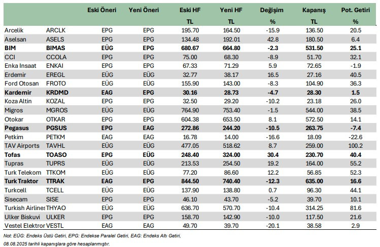 08.08.2025 kapanış fiyatlarına göre hesaplanan verilere göre: