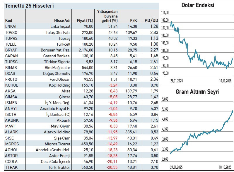 Temettü 25 Endeksi’nin öne çıkan şirketlerinden Enka İnşaat, düzenli kâr payı ödemeleriyle yatırımcı nezdinde istikrarlı bir profil sergiliyor. Şirket bu yılın içinde sonuncusu 8 Ekim’de olmak üzere üç kez temettü ödemesi gerçekleştirdi.