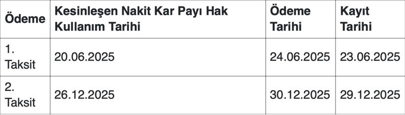 İlk taksitin payları Borsa‘da işlem gören pay sahiplerinin hesaplarına giriş yapacağı tarih 24 Haziran 2025, ikinci tarihin giriş yapacağı tarih ise 30 Aralık 2025 olacak.