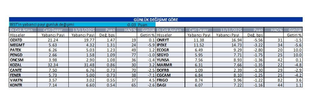 Abone olİş Yatırım’ın 17 Kasım 2025 tarihli raporunda, yabancı yatırımcı bazlı hisse senetlerine ilişkin günlük yabancı oranları tablosu paylaşıldı. Raporda, yabancı payı en çok artan ve en çok azalan hisselere yer verildi.