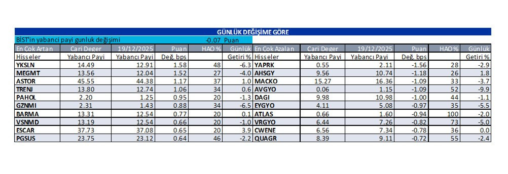 Abone olİş Yatırım’ın 23 Aralık 2025 tarihli raporunda, yabancı yatırımcı bazlı hisse senetlerine ilişkin günlük yabancı oranları tablosu paylaşıldı. Raporda, yabancı payı en çok artan ve en çok azalan hisselere yer verildi.