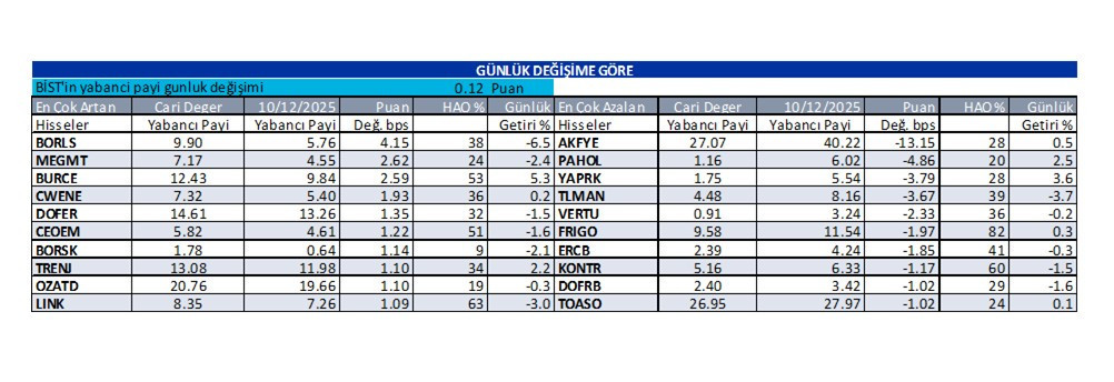 Abone olİş Yatırım’ın 12 Aralık 2025 tarihli raporunda, yabancı yatırımcı bazlı hisse senetlerine ilişkin günlük yabancı oranları tablosu paylaşıldı. Raporda, yabancı payı en çok artan ve en çok azalan hisselere yer verildi.
