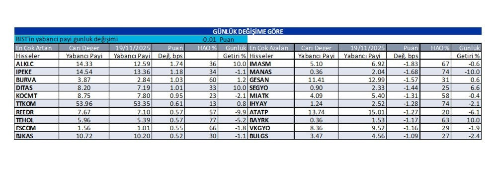 Abone olİş Yatırım’ın 21 Kasım 2025 tarihli raporunda, yabancı yatırımcı bazlı hisse senetlerine ilişkin günlük yabancı oranları tablosu paylaşıldı. Raporda, yabancı payı en çok artan ve en çok azalan hisselere yer verildi.