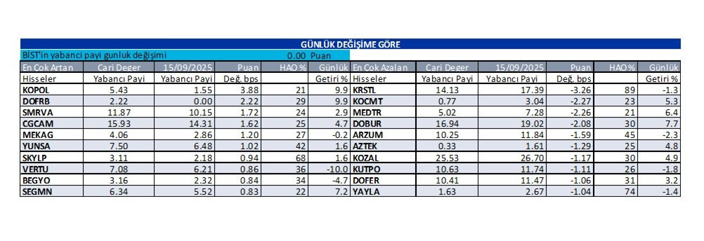 Abone olİş Yatırım’ın 17 Eylül 2025 tarihli raporunda, yabancı yatırımcı bazlı hisse senetlerine ilişkin günlük yabancı oranları tablosu paylaşıldı. Raporda, yabancı payı en çok artan ve en çok azalan hisselere yer verildi.