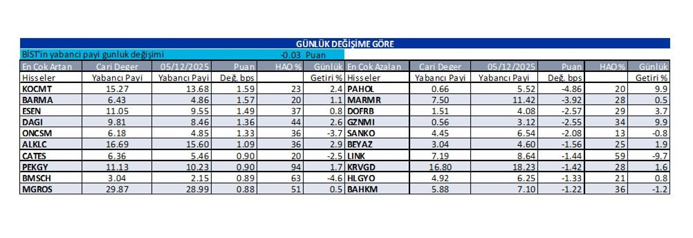 Abone olİş Yatırım’ın 9 Aralık 2025 tarihli raporunda, yabancı yatırımcı bazlı hisse senetlerine ilişkin günlük yabancı oranları tablosu paylaşıldı. Raporda, yabancı payı en çok artan ve en çok azalan hisselere yer verildi.