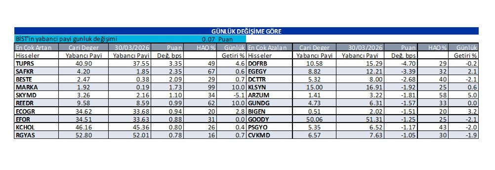 "Bugün çıkan raporumuzda, günlük bazda yabancı oranı en çok artan hisseler; TUPRS:3.35 bps, SAFKR:2.35 bps, BESTE:2.09 bps, iken, azalan hisseler ise; DOFRB:-4.7 bps, EGEGY:-3.39 bps, DCTTR:-2.68 bps. olarak görüntülenmektedir.
