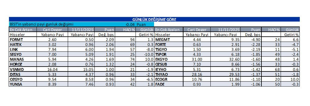 "Bugün çıkan raporumuzda, günlük bazda yabancı oranı en çok artan hisseler; FORMT:2.09 bps, HATEK:2.06 bps, LINK:1.94 bps, iken, azalan hisseler ise; MEGMT:-4.9 bps, FORTE:-2.28 bps, TSGYO:-2.19 bps. olarak görüntülenmektedir.