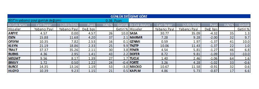 Abone olİş Yatırım’ın 14 Ocak 2026 tarihli raporunda, yabancı yatırımcı bazlı hisse senetlerine ilişkin günlük yabancı oranları tablosu paylaşıldı. Raporda, yabancı payı en çok artan ve en çok azalan hisselere yer verildi.