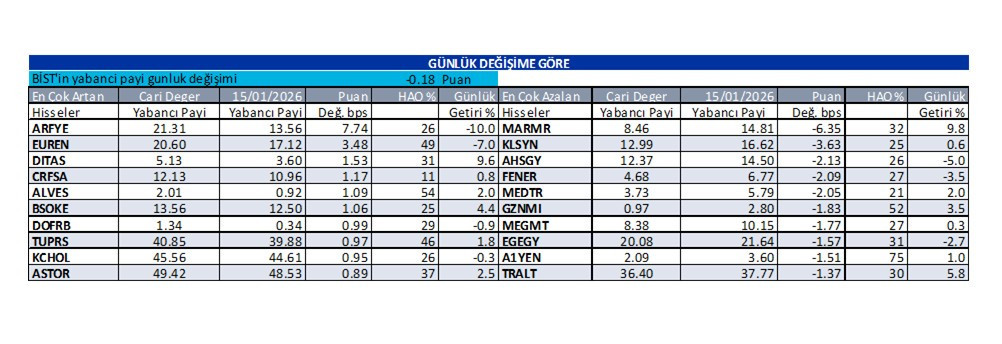 Abone olİş Yatırım’ın 19 Ocak 2026 tarihli raporunda, yabancı yatırımcı bazlı hisse senetlerine ilişkin günlük yabancı oranları tablosu paylaşıldı. Raporda, yabancı payı en çok artan ve en çok azalan hisselere yer verildi.