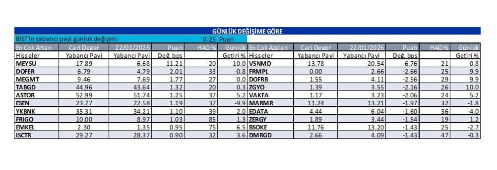 Abone olİş Yatırım’ın 26 Ocak 2026 tarihli raporunda, yabancı yatırımcı bazlı hisse senetlerine ilişkin günlük yabancı oranları tablosu paylaşıldı. Raporda, yabancı payı en çok artan ve en çok azalan hisselere yer verildi.